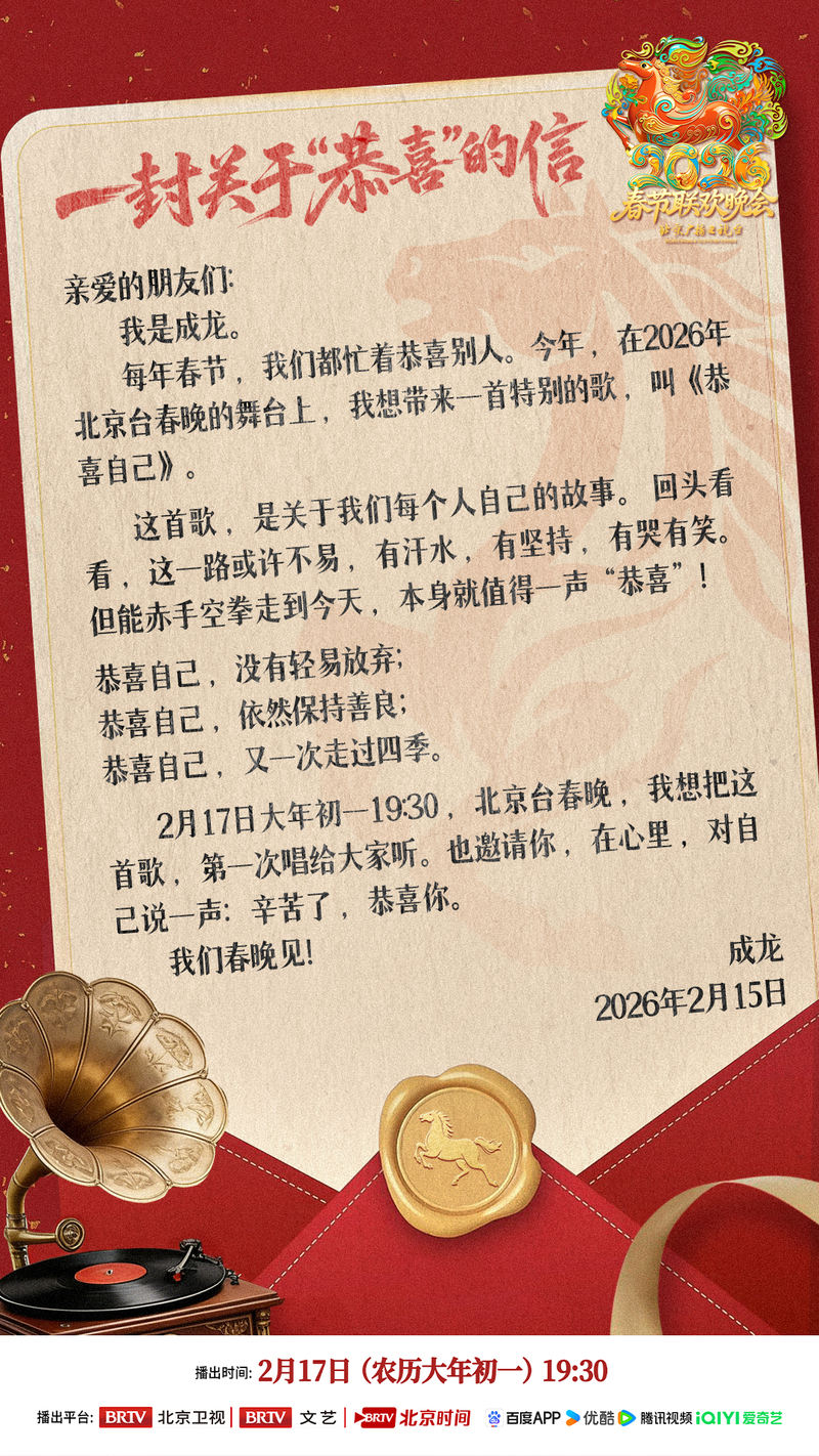 当春天来临时,亲密的朋友聚集在新的歌曲周围。庆祝北京广播电视台2026年春节超级惊喜节目正式公布。成龙真情新作贺岁短片《​​恭喜自己》即将上映。此次,他邀请了周星驰、王力宏、谢霆锋、张杰四位乐坛挚友发声,以真挚的和声在银幕上展现硬汉温柔的一面。五十年的光影已经过去,大哥成龙的名字早已与“坚持”和“努力”紧密联系在一起。从片场武术到成为举世闻名的功夫巨星,他利用无数脆弱的时刻,为自己创造了传奇。这首歌《恭喜自己》是他用半生时间积累的感人独白。他特意召集了一群朋友来共同探讨齐心协力,只为在新年之际,将这首歌献给所有在生活中努力奋斗的人们。歌曲中的一句“我诚实地与时间作斗争,亲手走到了这里”,表达了他一生的奋斗和勇气,相信会在万千听众的心中产生共鸣。这种隐藏在歌曲中的力量将伴随着新年的灯光照亮你的道路。北京广播电视台2026年春节联欢晚会将于晚上7时30分在北京卫视、北京文学频道、北京时间客户端等平台联播。 2月17日(农历大年初一)。让我们留下这段真挚的新年短片吧。给自己一个拥抱,对着成龙和明星的声音说“恭喜自己”。 “春风得意,马蹄吉祥”,在马年里,愿我们都把这句肯定带回家,爱你们,继续前行。编辑刘嘉妮