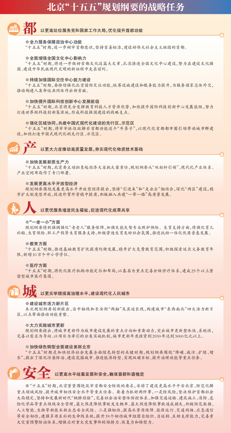 /徐迎建 ■北京的“首都”解读,意味着更加注重优化完善首都功能。 “十五五”期间,北京将更加注重优化完善首都功能,打造营造更好、更安全的中央政务环境,推动传统与现代有机融合,不断提高国家重大活动的服务保障水平,为国家科技自主作出更大贡献,将凸显政治中心、文化中心、国际交流中心、科技创新中心特色,建设现代化首都地区,更好发挥引领作用。为京津冀三省合作发展作出贡献。为全面履行和保障中央政治中心职能,北京将积极优化中央政治职能布局,坚持最佳标准开展和保障重大活动。同时,推动老城区平房区保护和振兴,打造舒适便捷的生活环境。改善居住环境,形成古今结合的老城风貌。为全面提升国家文化中心影响力,北京将加强历史文化名城保护,建设高水平“演艺之城”、“博物馆之城”、“图书之城”、“国际双奥赛事名城”。 “十五五”期间,“人均获得文化设施服务数量”指数将从6.69提高到8.5以上。在继续加强国际交往中心能力建设方面,北京将加快第四使馆区及周边地区的规划建设,使北京成为在京工作、生活、旅游的理想场所。提高外国人服务水平的政策将分类实施。 “十五五”期间要优化服务越来越多的外国人可以把北京作为他们来中国的第一站。他预计,经北京港进出港的国内航班将增至约3.8%。在加快建设国际科技创新中心方面,社会研究与实验发展总经费占地区生产总值的比重达到6%以上,打造具有全球重要性的科学中心和创新高地。京津冀协同发展是新时代第一个重大区域战略。 “十五五”期间,北京将全力推进现代化首都地区建设,构建交通圈、功能圈、产业合作圈嵌套协调的循环结构。同时,全面推进协同创新和产业协作。北京“工业”已全面实施“人工智能+”。高质量发展是实现现代化的主要任务和必由之路。规划纲要指出,“十五五”期间,北京将更加注重提质增效,解决了夯实工业基础、着力扩大内需、深化改革开放等重要问题。发展新产能是推动高质量发展的本质要求和关键途径。 “十五五”期间,北京将认真实施“人工智能+”行动,数字经济增加值年均增速目标设定在8%左右。加快绿色科技创新中心建设,绿色经济重点产业年均增长6%左右的目标。与此同时,北京规划发展战略产业、新兴产业产业、现代服务业、现代农业等,未来形成5万亿美元的产业集群。规划纲要中也明确了该市的主要产业。例如,人工智能产业以海淀区为中心,支撑全市各区差异化发展,包括北京经济技术开发区、朝阳区、石景山区、门斗沟区等。先进绿色能源产业重点建设昌平区、中关村(房山)绿色能源产业园、大兴区国际氢能示范区和海大区数字能源集聚区等“能源谷”。在规划总结中,顶层围绕发展开放型经济,“十五五”期间,本市提出以“两区”建设为重要抓手,加快推进开放型经济加强条款、法规、管理、标准等制度性开放,在扩大国际合作的同时增强开放能力。加大制度开放力度,培育外贸发展新动力。服务贸易年均增速达到5%左右。鼓励外资企业设立地区总部和研发总部,力争将在京外资研发中心数量由332个增加到500个左右。同时,聚焦高质量“走出去”,全面推进空中丝绸之路中央中心建设,强化北京“一带一路”直达列车一站式服务平台“线上+线下”一站式服务功能,完善海外一站式服务。将打造一批人工智能、区块链、商业航天、平台经济等领域的企业体系建设、海外拓展,推动“北京标准”、“北京智造”全球拓展。北京“村”将为人民提供更好的服务,改善人民的生活福祉。中国式现代化是全体人民共同富裕的现代化。 。 “十五五”期间,北京将更加注重民生投资的全面性、基础性、综合性。从“老人和孩子”的角度,北京将大力发展养老服务或普及养老服务,优化养老服务供给体系,强化居家养老的基础性作用,加强居家养老床位建设,推进老年友好型住房改造,实现周边社区养老服务中心(市)服务覆盖率达到80%。计划纲要特别强调加强服务保障为“老年人”提供服务,并加强为残疾人和痴呆症患者提供专业护理。养老院床位比例是该规划的新指标之一,“十五五”期间将由68%提高到73%。在生育支持方面,加强生育补贴、生育保险、职工产假等生育服务支持,积极营造有利于生育的社会氛围,推动综合育儿高质量发展。 “三岁以下儿童入托中心的出勤率上升”也成为一个新指标。推动“十五五”期间增长约15个百分点,到2030年底达到25%左右。预计在教育方面,规划纲要指出,“十五五”期间,政府将加快建设适应人口变化和经济社会发展的教育服务体系,促进基础教育规模和质量均衡发展,不断扩大免费教育范围,积极探索教育免费途径。扩大义务教育范围,增加中小学容量10万所。推进城市大学部门改革,扩大优质大学教育招生规模,新增高等教育学位10万个。提升职业学校办学管理能力,探索深度运用人工智能的未来教育新模式。医疗卫生方面,“十五五”期间,北京将优化医疗机构功能布局和设计,完善以基层为中心的分级诊疗体系,建设25个以上紧凑型城市医疗集群,强化医疗服务体系建设。发展儿科、老年病、精神卫生和精神卫生服务,健全医疗卫生、健康保险、医疗卫生协调发展和治理机制,推动国民健康数字化、智能化建设。改造北京的“城市”城市形象越来越符合人们