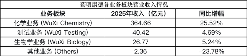 新京报贝壳财经讯(鼎轩记者)3月23日,药明康德发布2025年年度报告。报告期内,公司实现营业利润454.56亿元,比上年增长15.84%。归属于上市公司股东的净利润约为191.51亿元,较上年同期增长102.65%。该公司在年报中表示,出售子公司无锡XDC开曼有限公司部分股份以及出售部分业务的收益也为其盈利做出了贡献。扣除非经常性损益后归属于母公司的净利润较上年同期增长32.56%。截至2025年12月末,公司持续商业订单金额580亿元,比上年增长28.8%。报告期内,公司持续经营收入434.2亿元,其中来自美国客户的收入为312.5亿元,比上年增长34.3%。来自欧洲客户的收入为48.2亿元人民币,同比下降4%。来自中国客户的销售额为54.7亿元人民币,比上年下降3.5%。其他地区客户接待金额18.8亿元,同比增长4.1%。业务方面,2025年其他业务同比下降23.78%,药明康德化学、检测和生物业务收入同比增长。其中,化工业务实现收入364.7亿元,比上年增长25.5%。该业务的增长主要受益于我们分子 CDMO 产品组合的持续扩张。 2025年,公司小分子D&M业务收入预计为199.2亿元,同比增长11.4%。药明康德董事长兼首席执行官李革表示,预计公司整体营收将达到2026年达到513亿元至530亿元,持续经营收入同比实现18%至22%的快速增长,调整后自由现金流达到10.5至115亿元。校对刘宝庆