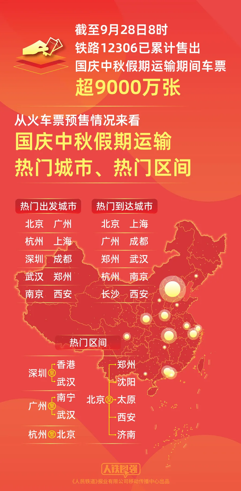 根据北京新闻中国铁路的报道,铁路运输将于9月29日开始,并将于10月10日在12天结束。国家铁路将派遣2.19亿乘客,并在10月1日领先最高的乘客流动。平均每日计划将启动约13,000名乘客火车。今年,国庆日和为期5天的节日将结合八天的假期。旅游需求,例如旅游,来访的亲戚和学生乘客流相互交织并分层。铁路流量在开始和完成期间具有较大的总体积,并且表现出高浓度的特征,“起点和末端的长距离,中心的长距离,中心的长距离,中间的距离很短”。铁路部门遵守以人为中心的发展理念,积极适应假期期间乘客的各种需求,仔细制定运输计划,有效地提高运输能力,增强能力NS车站和公交服务措施,并为乘客安全,温暖的旅行和柔和的运营提供运输支持。在9月28日的8:00,Railway 12306在国家节日的圣诞节运输期和州长(9月29日至10月10日)中售出了超过9000万张门票。从先前销售火车票的销售来看,国庆节假期中的流行城市和总理主要是北京,广州,杭州,上海,上海,深圳,成都,武汉,Zhengzhou,Zhengzhou,Nanjing和Xi’an和Xi’an。到达的受欢迎城市主要是北京,上海,广州,成都,郑州,武韩,杭州,nanjing,nanjing,changsha,changsha,xi’an。受欢迎的运输奇特岛相对集中在深圳,例如深圳到香港和武汉,北京,郑州,朝扬,钟阳,台湾,西安,吉南,吉南,吉南,纳恩宁,旺宁,旺汉,温尔斯,吉祖,吉祖。台湾Xi’an Datong到B埃伊(Eijing),纳吉(Nanjing)上海,南京(Nanjing),其他方向就足够了。火车和其他方向从北京到霍霍特,北京,北京,郑州,武汉,北京,上海,尼西诺,广州,西南,参议院,参议院。在10月6日至10日假期之后的最大回报期间,仍然可以使用一些从香港到深圳,北京,上海,成都,Xi’an,Xi’an,Guangzhou和Nanning的火车。从北京,北京,台湾,杨,青春,上海,武汉,Zhengzhou,Zhengzhou,shengdu,wuhan,wuhan,guanganghou到北昌,还有其他方向。从10月2日至5日,从香港到深圳,广州,北京,上海,霍霍特和Xi’an的几列火车的广泛门票。北部和南部还有其他门票,以及从上海到武汉,杨,哈尔滨,哈尔滨,大提琴,辛吉,朝州,郑州,申杜,上海,上海,香港,武湖,武豪的其他方向。 Liu Jiani编辑