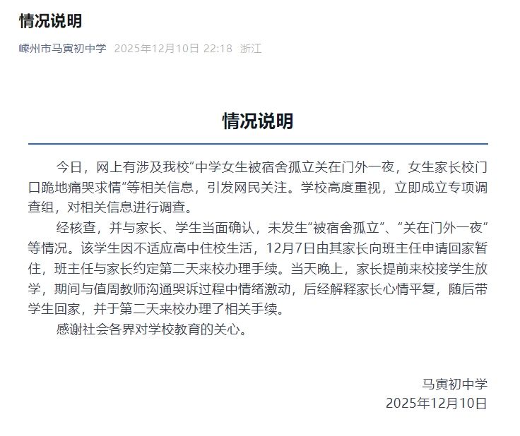 新京报:浙江省嵊州市马隐中学12月10日发布声明。今日,该校信息在网上发布,“一名高中女生被隔离在宿舍过夜,女生家长跪在校门口哭泣求饶”等相关信息引发网友关注。学校考虑到这一点,立即成立了专门调查组,对相关信息进行调查。经核实身份并与家长、学生面对面确认,未发生“被隔离在宿舍”、“被锁在门外过夜”的情况。由于学生无法适应高中校园生活,12月7日,家长向班主任提出临时探亲假,班主任和家长同意我第二天回校办理手续。当天晚上,家长就赶到了学校ol 很早就去接学生了。在与值班老师的互动中,孩子们流下了眼泪,情绪激动。解释完后,家长平静地带着学生回家。第二天,我去学校并完成了文书工作。对社会各界对学校教育的关心表示感谢。陈艳婷编辑